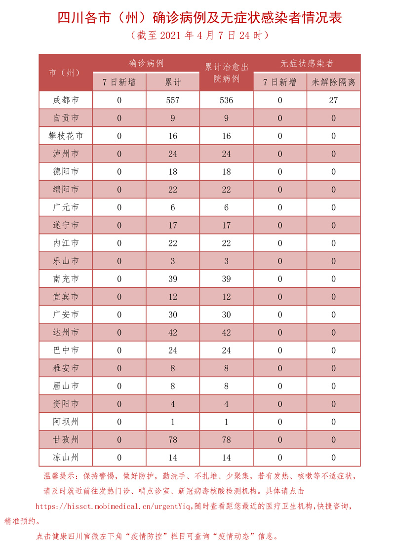 4月7日0-24时,四川无新增新型冠状病毒肺炎确诊病例,新增治愈出院病例2例,无新增疑似病例,无新增死亡病例。