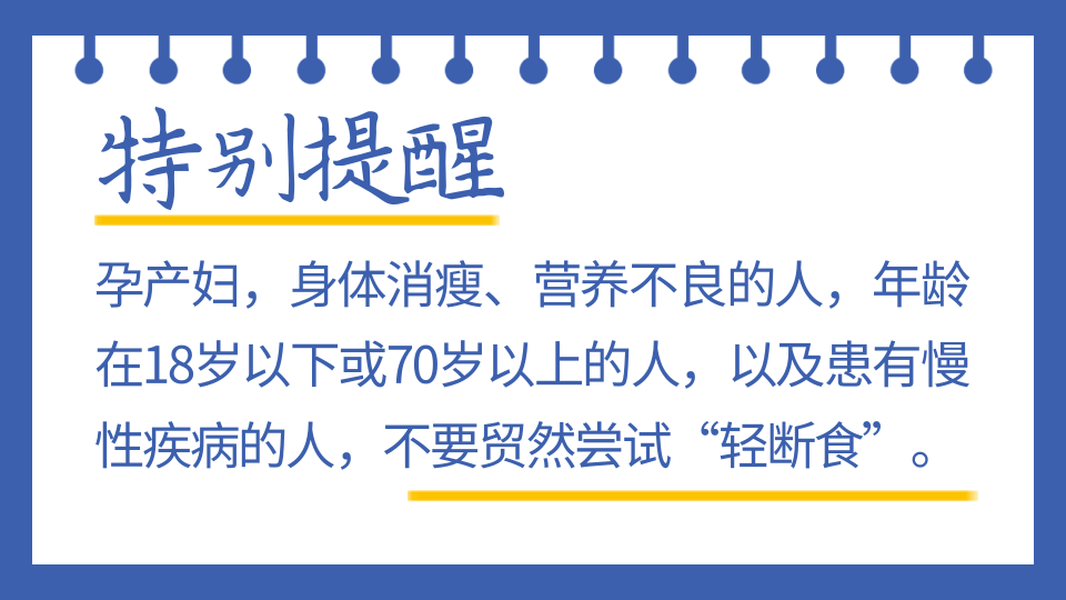 减肥贵在坚持,“轻断食”也是这样。由于个体差异的存在,“轻断食”好或不好还需辩证看待。开始“轻断食”之前,请注意它可能带来的负面影响,建议在医生的指导下进行。