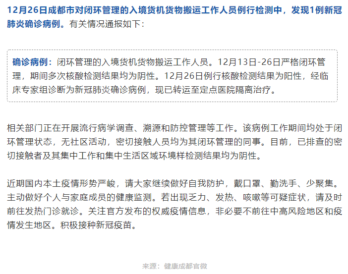 成都一名闭环管理的入境货机货物搬运工作人员检出核酸阳性