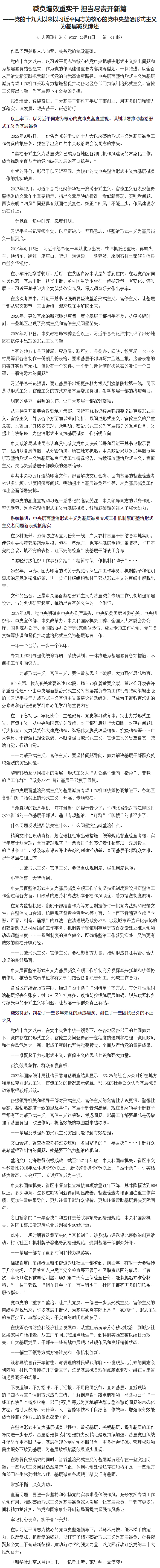 减负增效重实干 担当尽责开新篇——党的十九大以来以习近平同志为核心的党中央整治形式主义为基层减负综述