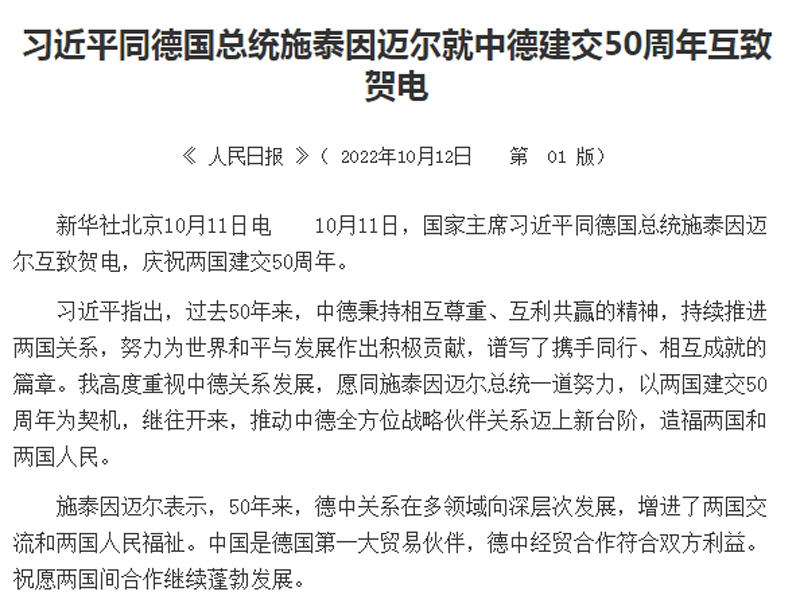 习近平同德国总统施泰因迈尔就中德建交50周年互致贺电