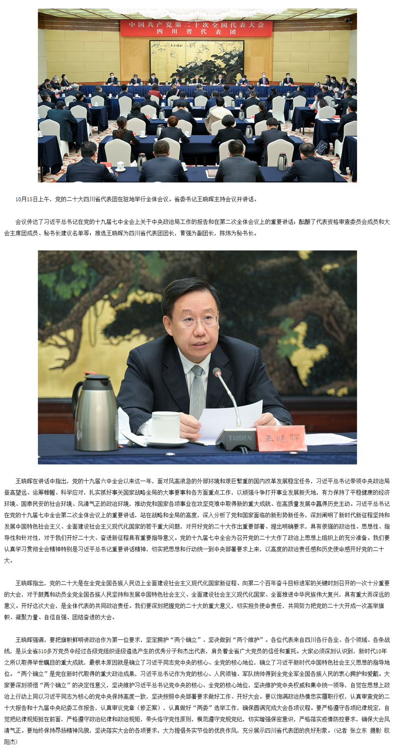 党的二十大四川省代表团举行全体会议 推选王晓晖为团长 黄强为副团长 陈炜为秘书长