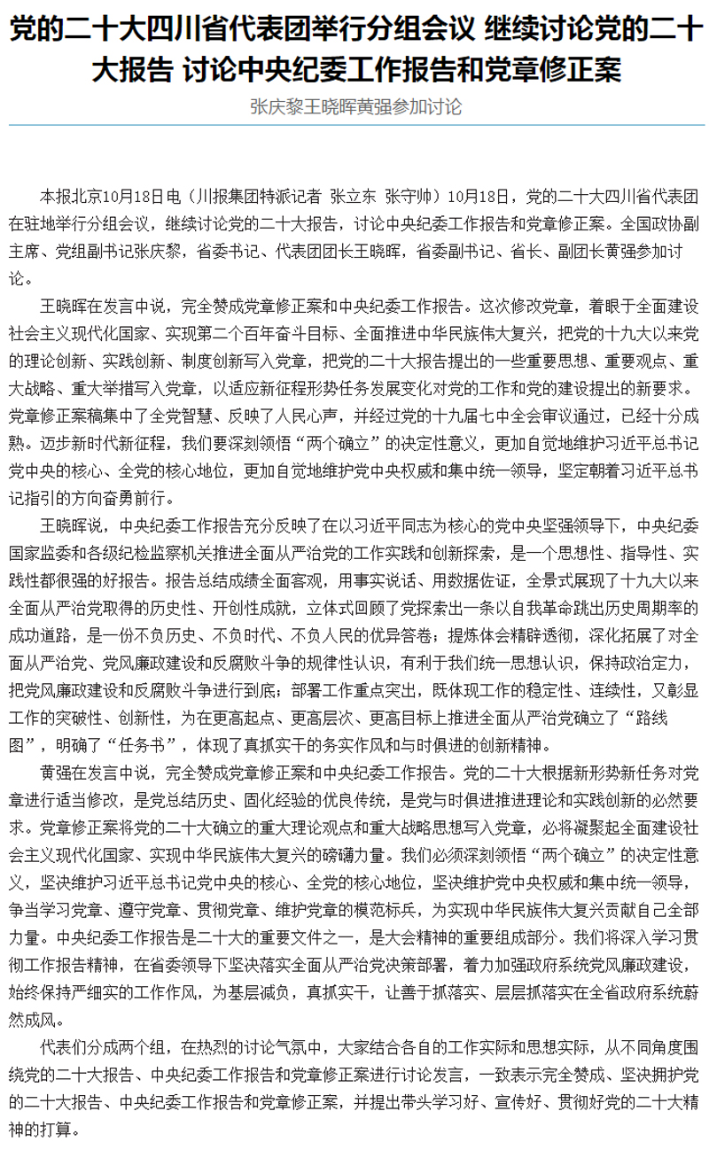 党的二十大四川省代表团举行分组会议 继续讨论党的二十大报告 讨论中央纪委工作报告和党章修正案 张庆黎王晓晖黄强参加讨论