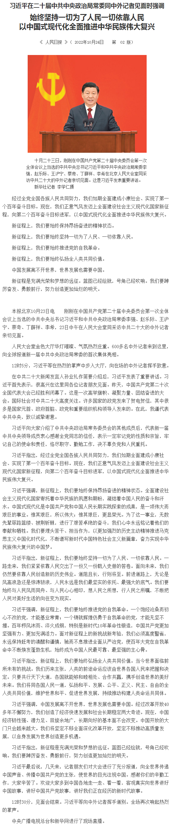 习近平在二十届中共中央政治局常委同中外记者见面时强调,始终坚持一切为了人民一切依靠人民,以中国式现代化全面推进中华民族伟大复兴