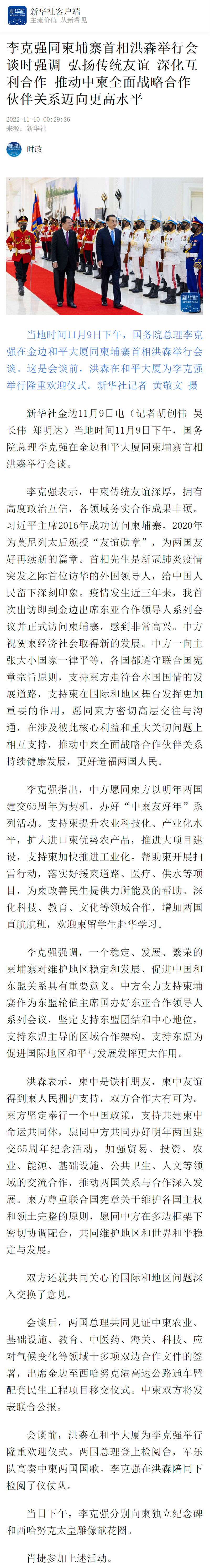 李克强同柬埔寨首相洪森举行会谈时强调弘扬传统友谊深化互利合作推动中柬全面战略合作伙伴关系迈向更高水平