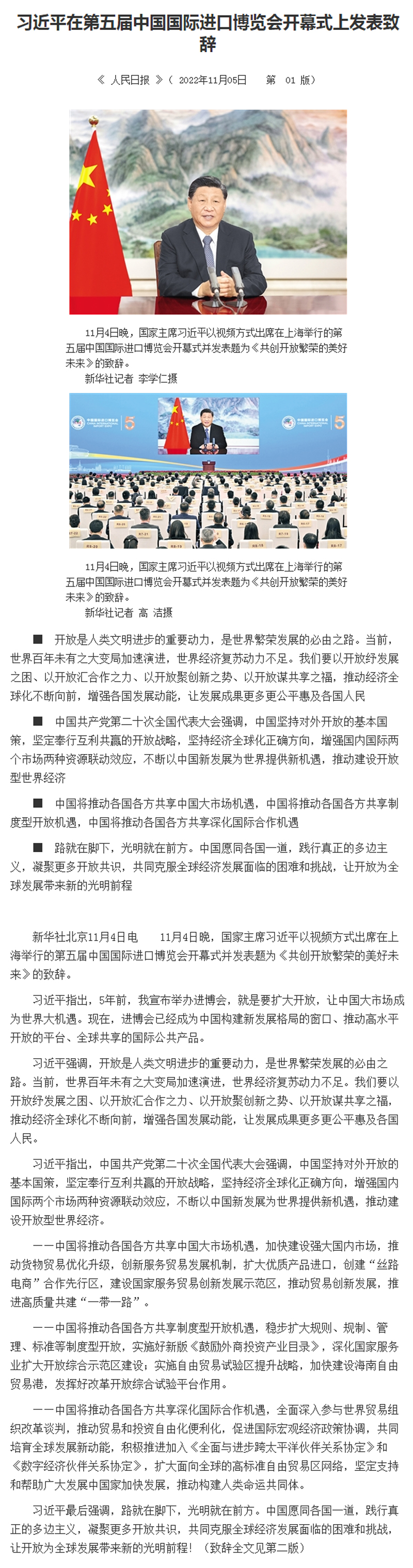 习近平在第五届中国国际进口博览会开幕式上发表致辞