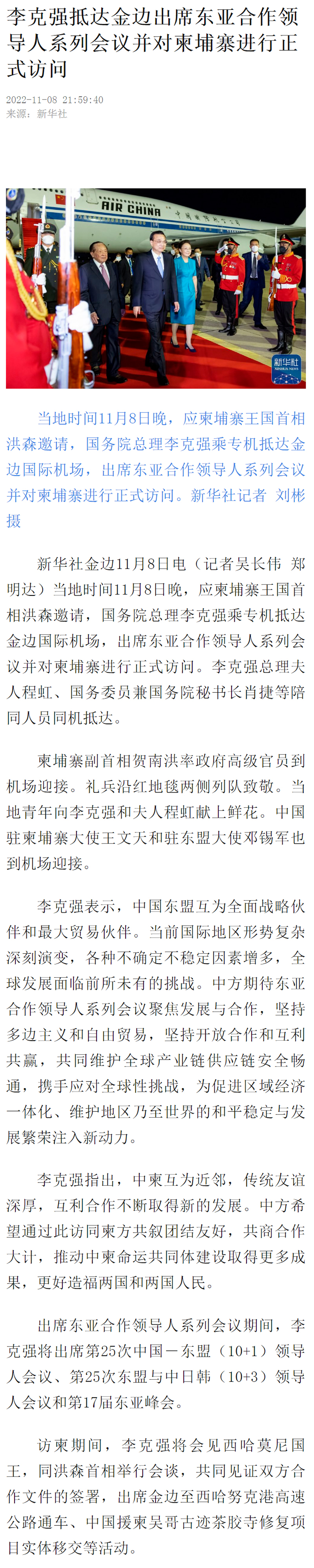 李克强抵达金边出席东亚合作领导人系列会议并对柬埔寨进行正式访问