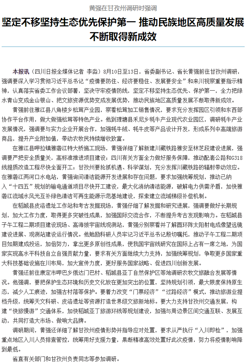 黄强在甘孜州调研时强调:坚定不移坚持生态优先保护第一 推动民族地区高质量发展不断取得新成效