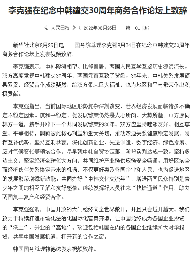 李克强在纪念中韩建交30周年商务合作论坛上致辞