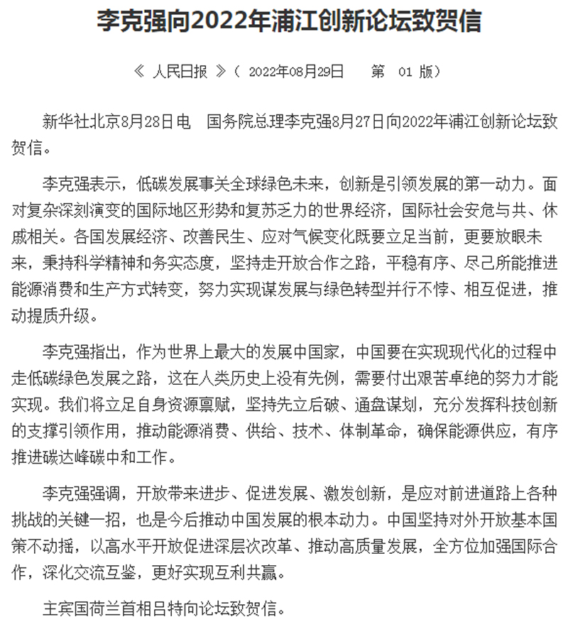 李克强向2022年浦江创新论坛致贺信