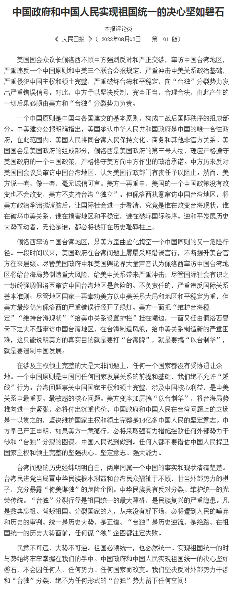 中国政府和中国人民实现祖国统一的决心坚如磐石