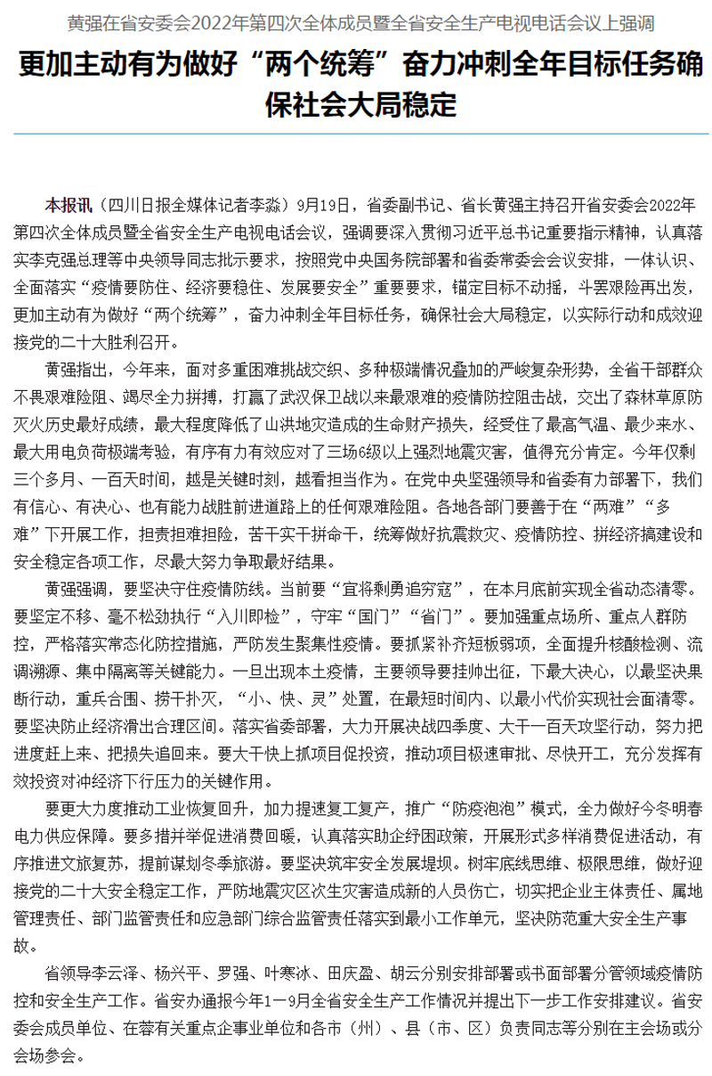 黄强在省安委会2022年第四次全体成员暨全省安全生产电视电话会议上强调:更加主动有为做好“两个统筹”奋力冲刺全年目标任务确保社会大局稳定