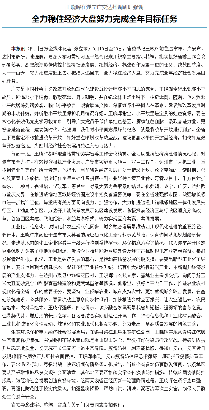 王晓晖在遂宁广安达州调研时强调:全力稳住经济大盘努力完成全年目标任务