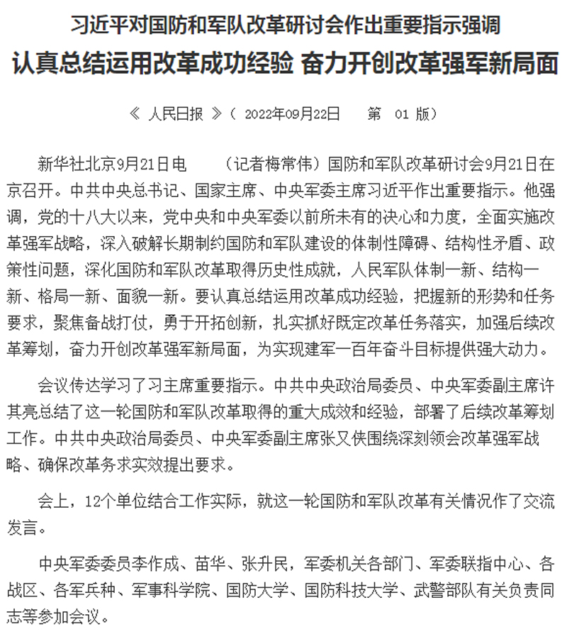 习近平对国防和军队改革研讨会作出重要指示强调:认真总结运用改革成功经验 奋力开创改革强军新局面