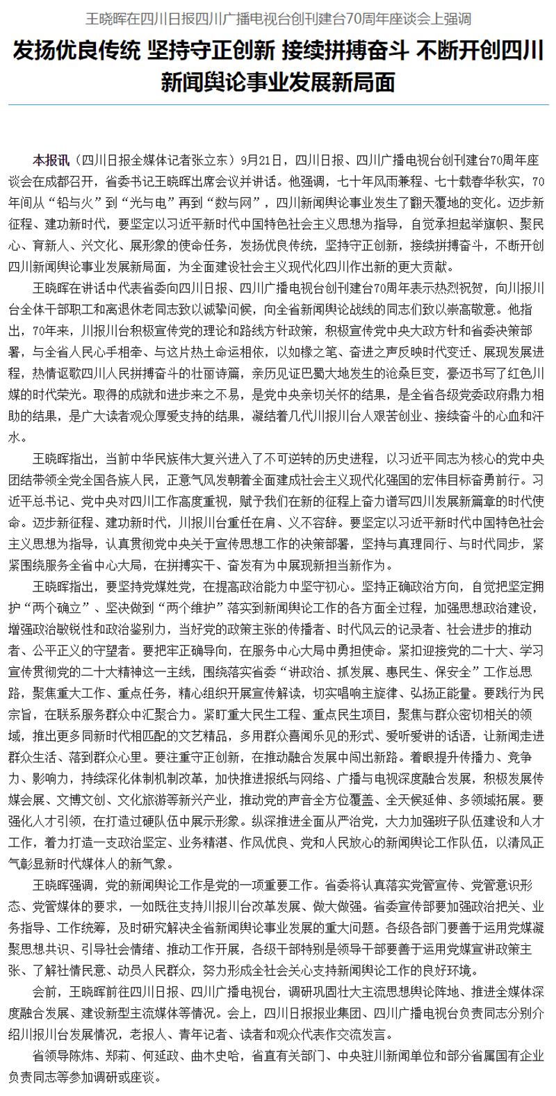 王晓晖:发扬优良传统 坚持守正创新 接续拼搏奋斗 不断开创四川新闻舆论事业发展新局面