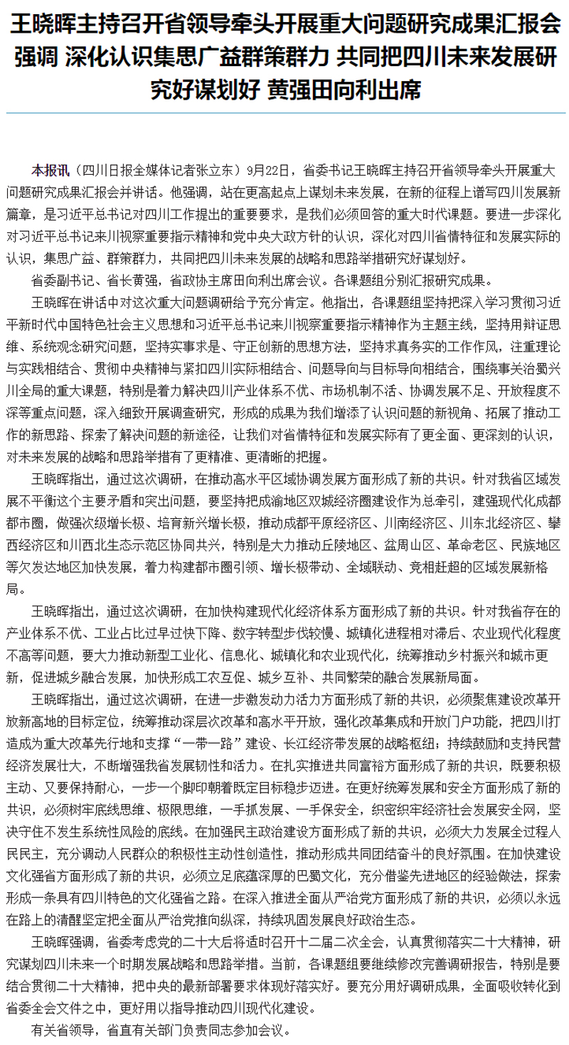 王晓晖主持召开省领导牵头开展重大问题研究成果汇报会强调 深化认识集思广益群策群力 共同把四川未来发展研究好谋划好 黄强田向利出席