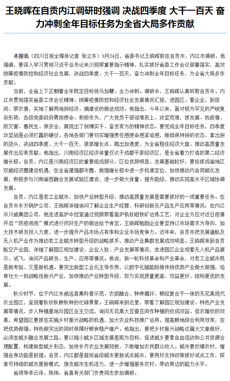 王晓晖在自贡内江调研时强调 决战四季度 大干一百天 奋力冲刺全年目标任务为全省大局多作贡献