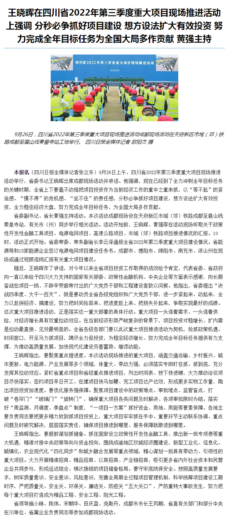 王晓晖在四川省2022年第三季度重大项目现场推进活动上强调分秒必争抓好项目建设想方设法扩大有效投资努力完成全年目标任务为全国大局多作贡献黄强主持