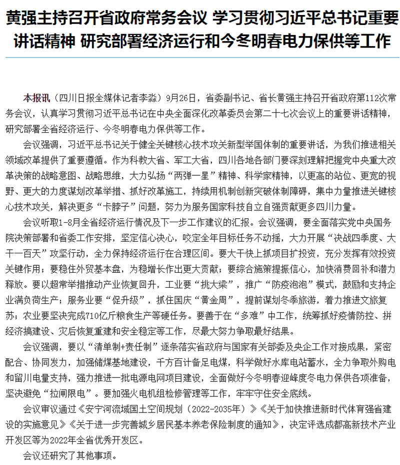 黄强主持召开省政府常务会议 研究部署经济运行和今冬明春电力保供等工作