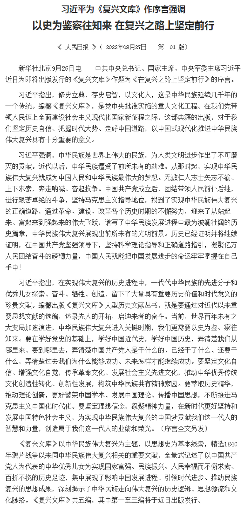 为《复兴文库》作序言强调以史为鉴察往知来在复兴之路上坚定前行