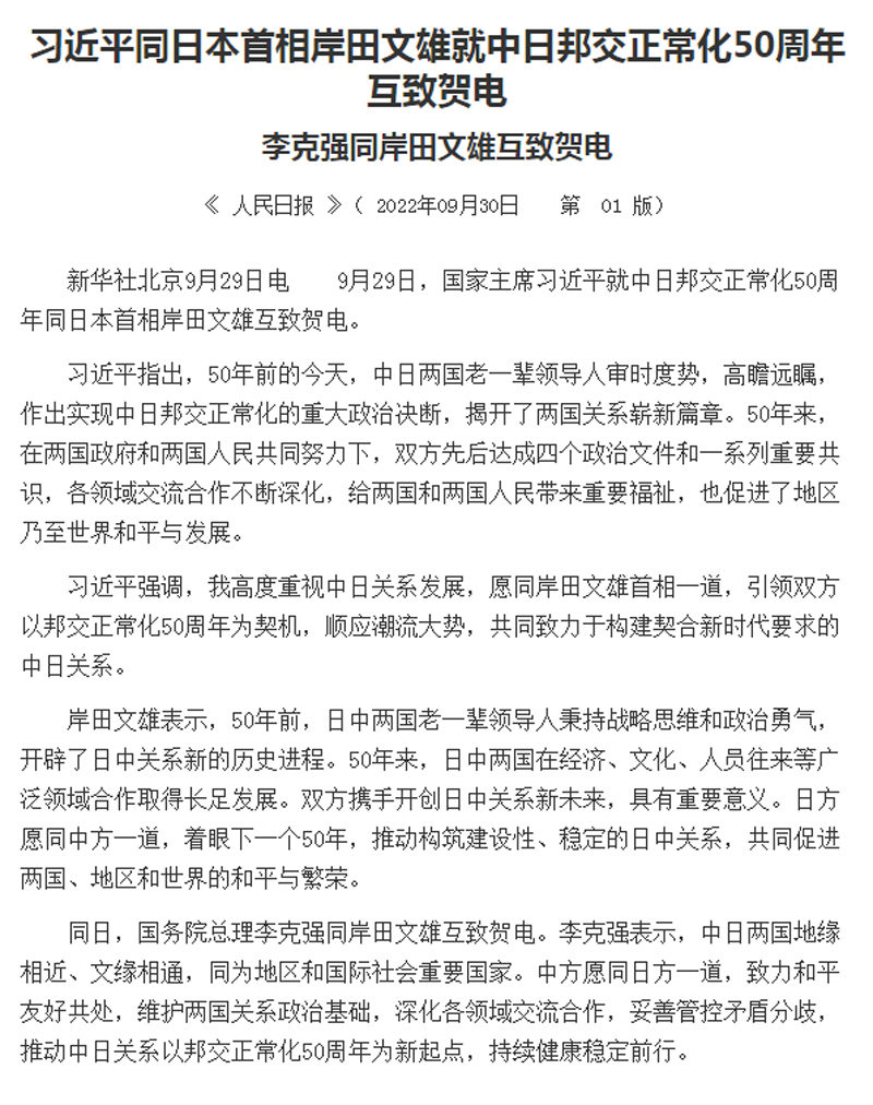 习近平同日本首相岸田文雄就中日邦交正常化50周年互致贺电