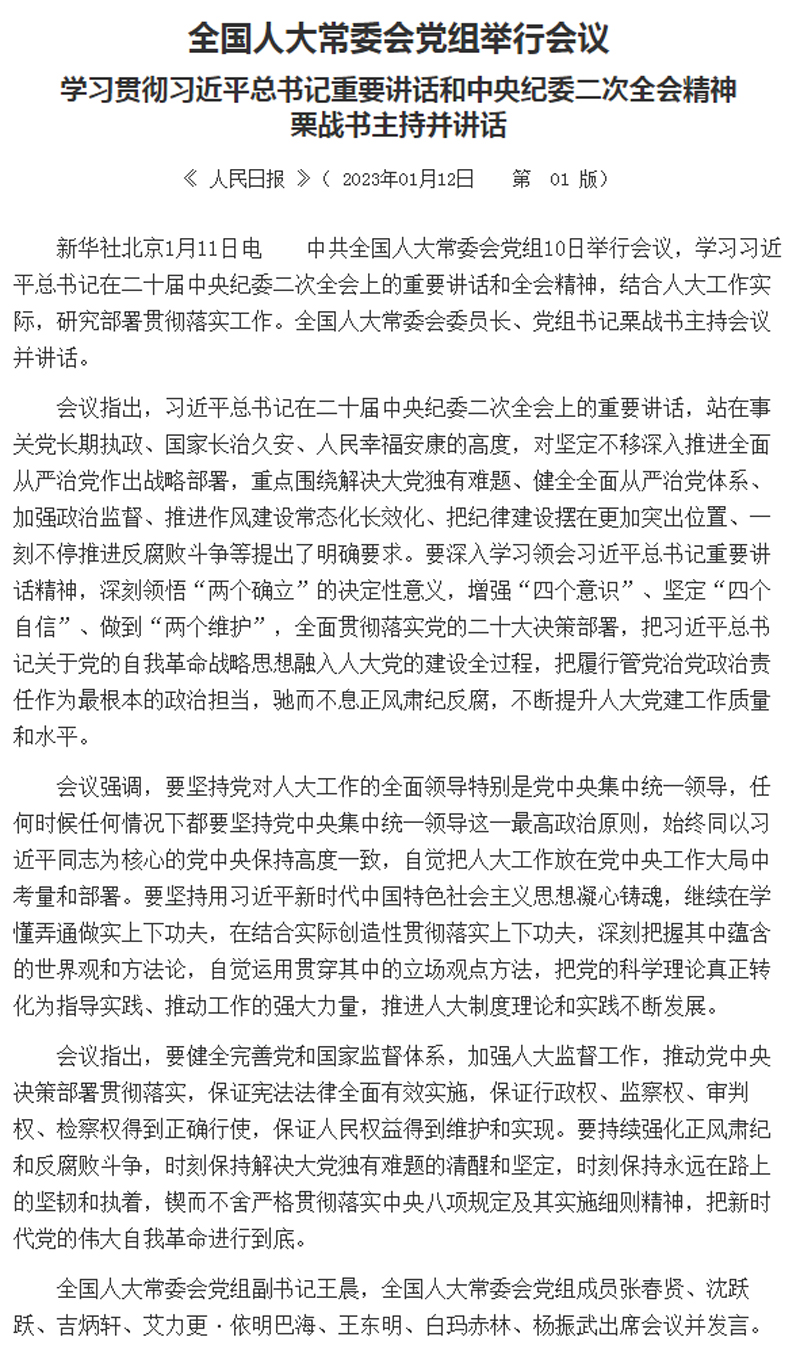 全国人大常委会党组举行会议 学习贯彻习近平总书记重要讲话和中央纪委二次全会精神 栗战书主持并讲话