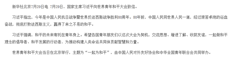 习近平向世界青年和平大会致信