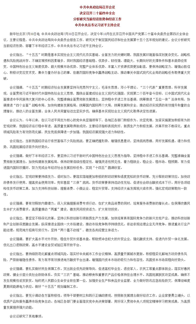 中共中央政治局召开会议 决定召开二十届四中全会 分析研究当前经济形势和经济工作 中共中央总书记习近平主持会议